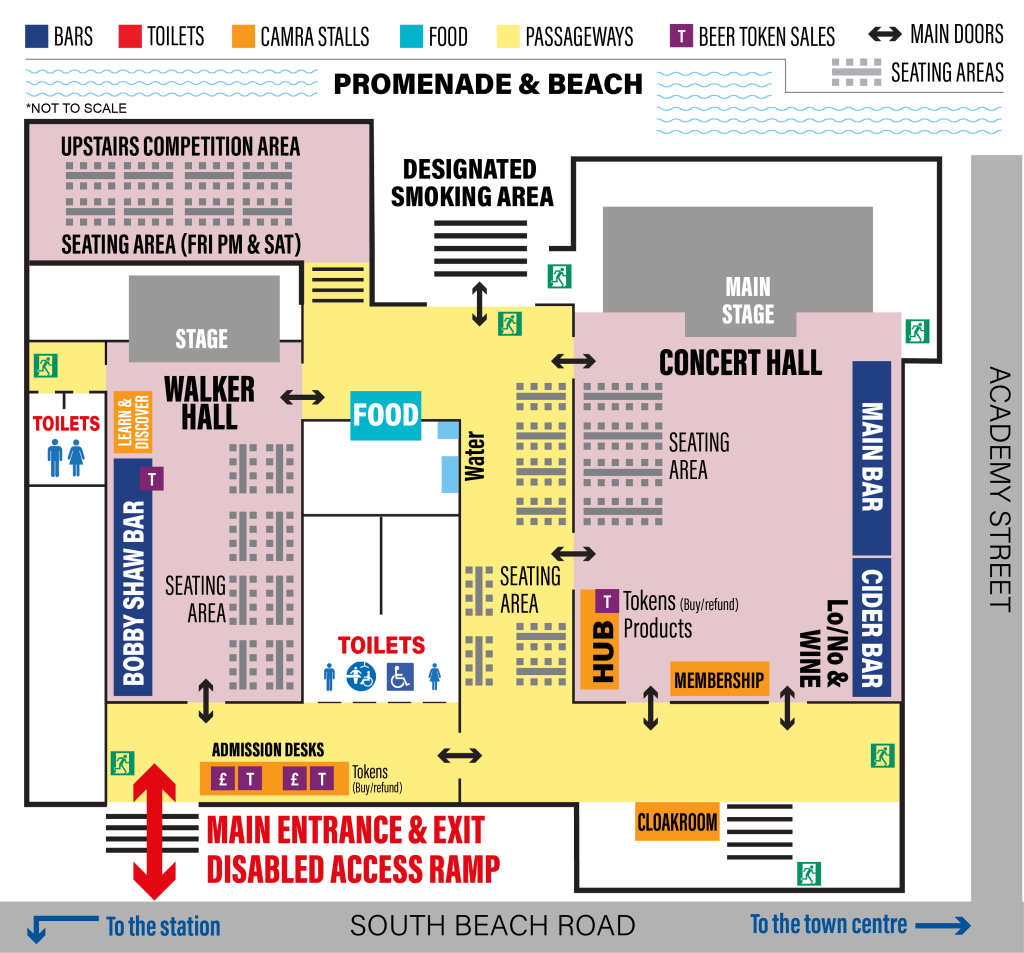 The main entrance/exit for the festival is located at the Walker Hall side of the building, on South Beach Road, close to the adjacent car park. This entrance is slightly more sheltered and is disabled-friendly with ramp access. The door at the rear of the building beside the designated smoking area also has ramp access from the promenade – speak to the stewards for any assistance. The festival bars and corridors all have level access. There is a Disabled and a Changing Places toilet available. No dogs allowed except registered assistance dogs. Over 18s only allowed in the festival.